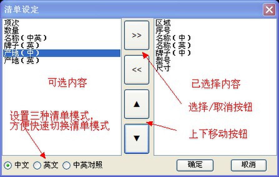 设置设备清单内容,包括设置中文,英文,中英对照三种清单模式